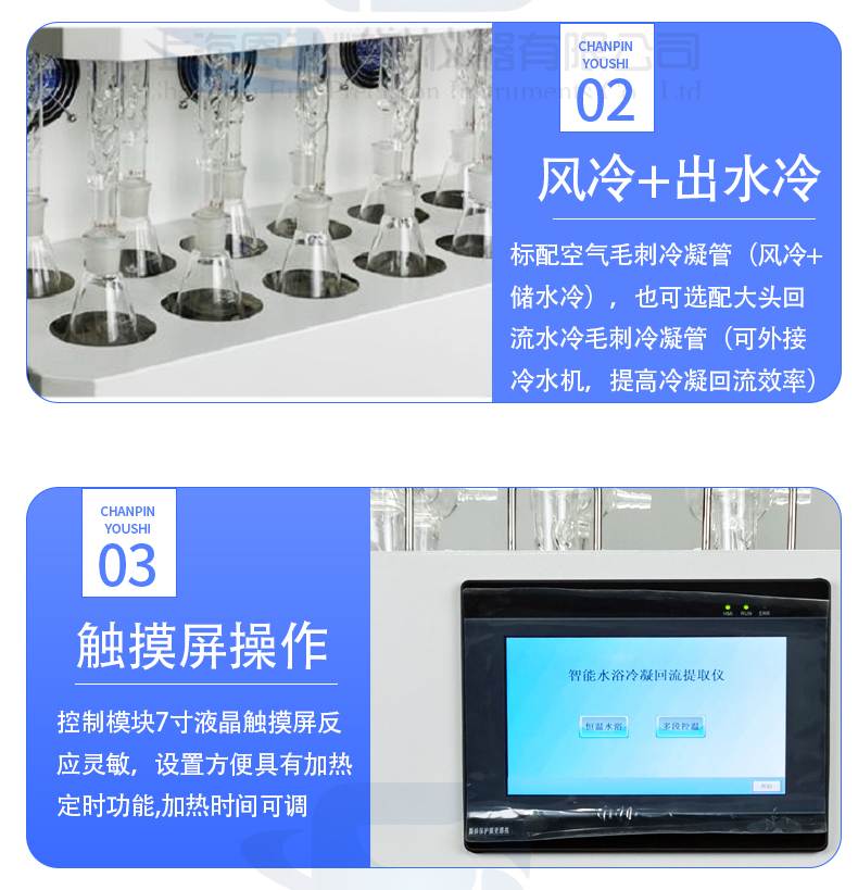 6、標(biāo)配空氣毛刺冷凝管(風(fēng)冷+儲(chǔ)水冷),也可選配大頭回流水冷毛刺冷凝管(可外接冷水機(jī),提高冷凝回流效率);